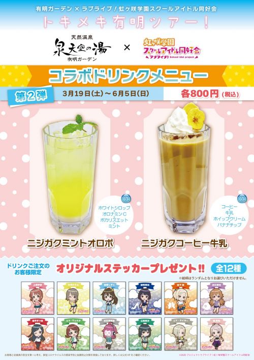 ラブライブ!ニジガクメンバーの描き下ろしランダムステッカー付きオリジナルドリンクを泉天空の湯内「有明キッチン」にて販売いたします。その他お食事もお楽しみいただけますので、ぜひお立ち寄りください。
